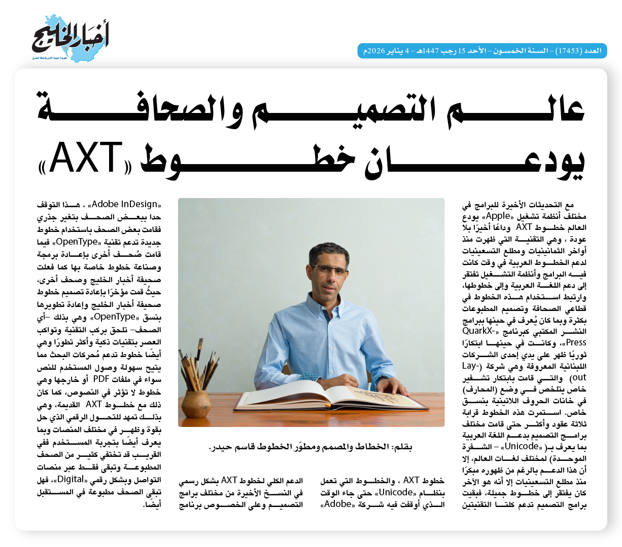 مع التحديثات الأخيرة للبرامج في مختلف أنظمة تشغيل Apple يودع العالم خطوط AXT وداعًا أخيرًا بلا عودة ، وهي التقنية التي ظهرت منذ أواخر الثمانينات ومطلع التسعينيات لدعم الخطوط العربية في وقت كانت فيه البرامج وأنظمة التشغيل تفتقر لدعم اللغة العربية ولخطوطها، وارتبط استخدام هذه الخطوط في قطاعي الصحافة وتصميم المطبوعات بكثرة وبما كان يُعرف في حينها ببرامج النشر المكتبي كبرنامج QuarkXPress، وكانت في حينها إبتكارًا ثوريًا ظهر على يدي إحدى الشركات اللبنانية المعروفة وهي شركة Layout والتي قامت بابتكار تشفير خاص يتلخص في وضع المحارف في خانات الحروف اللاتنية بنسق خاص. استمرت هذه الخطوط قرابة ثلاثة عقود وأكثر حتى قامت مختلف برامج التصميم بدعم اللغة العربية بما يعرف بـ( Unicode – الشفرة الموحدة) لمختلف لغات العالم، إلا أن هذا الدعم بالرغم من ظهوره مبكرًا منذ مطلع التسعينيات إلا أنه هو الآخر كان يفتقر لخطوط جميلة، فبقيت برامج التصميم تدعم كلا التقنيتين خطوط AXT ، والخطوط التي تعمل بنظام Unicode حتى جاء الوقت الذي أوقفت فيه شركة Adobe الدعم الكلي لخطوط AXT بشكل رسمي في النسخ الأخيرة من مختلف برامج التصميم وعلى الخصوص برنامج Adobe InDesign ، هذا التوقف حدا ببعض الصحف بتغير جذري فقامت بعض الصحف باستخدام خطوط جديدة تدعم تقنية OpenType فيما قامت صُحف أخرى بإعادة برمجة وصناعة خطوط خاصة بها كما فعلت صحيفة أخبار الخليج وصحف أخرى، حيثُ قمت مؤخرًا بإعادة تصميم خطوط صحيفة أخبار الخليج وإعادة تطويرها بنسق OpenType وهي بذلك -أي الصحف- تلحق بركب التقنية وتواكب العصر بتقنيات ذكية وأكثر تطورًا وهي أيضًا خطوط تدعم مُحركات البحث مما يتيح سهولة وصول المستخدم للنص سواء في ملفات PDF أو خارجها وهي خطوط لا تؤثر على النصوص، كما كان ذلك مع خطوط AXT القديمة، وهي بذلك تمهد للتحول الرقمي الذي حل بقوة وظهر في مختلف المنصات وبما يعرف أيضًا بتجربة المستخدم ففي القريب قد تختفي كثير من الصحف المطبوعة وتبقى فقط عبر منصات التواصل وبشكل رقمي Digital ، فهل تبقى الصحف مطبوعة في المستقبل أيضًا.